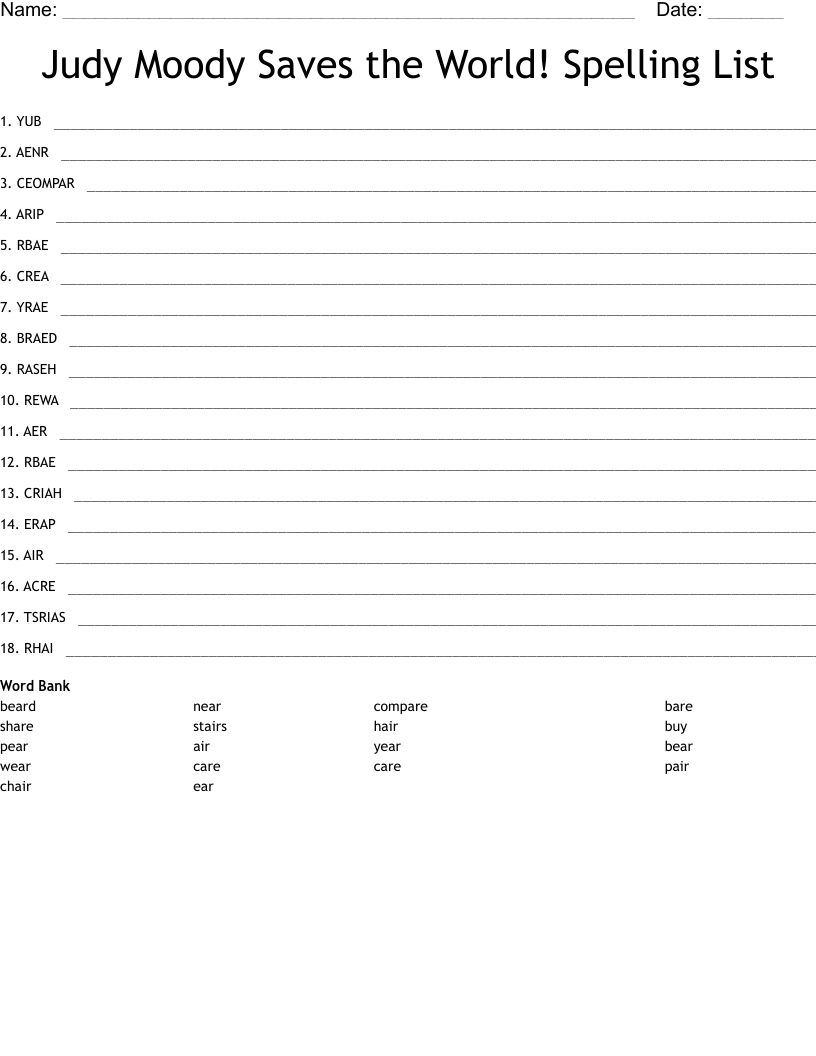 Judy Moody Saves The World Spelling List Word Scramble WordMint