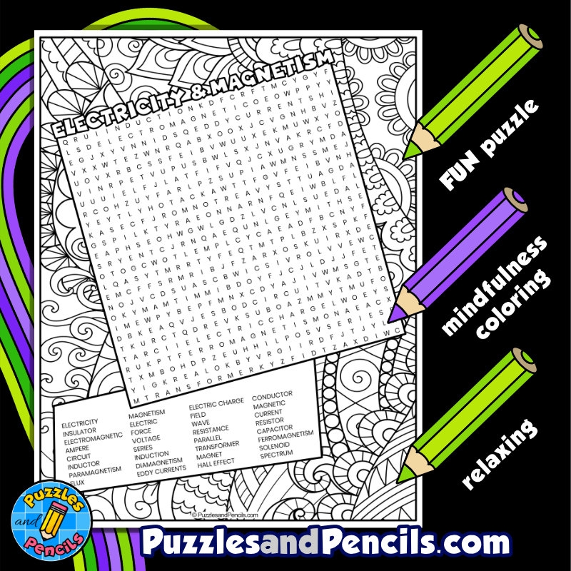 Electricity U0026 Magnetism Word Search Puzzle With Coloring Physics Wordsearch Made By Teachers